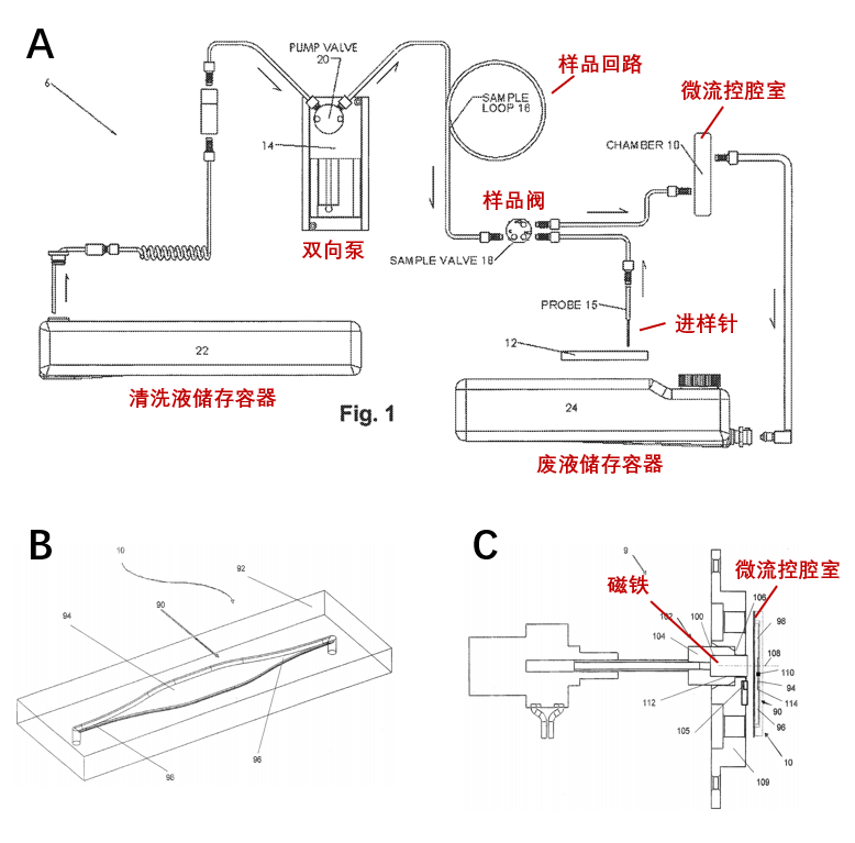 图 3 MAGPIX® 的(A)流体模块、(B)微流控腔室和(C)磁场控制模块示意图[5]