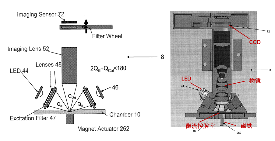 用于成像解码的光学模块类似于一个荧光显微成像系统。包含照明光源、物镜、滤光片、相机。MAGPIX® 分别采用 525 nm 和 635 nm 两束 LED 作为微球的编码通道和报告通道的激发光源,采用 CCD 相机进行编码微球的成像。如图所示,MAGPIX® 将这两种 LED(共 6 颗,且每颗 LED 前方装有相应波长的带通滤光片)配置成「环」形照明空间,在微流控腔室内形成均匀的照明场,对编码微球进行激发。微球被激发出的荧光通过一个 4 倍放大的物镜后再经过一个滤光片转盘,最终被 CCD 相机采集。通过 LED 的开关以及滤光片转盘的转动切换,实现对编码信号和报告分子信号的分别激发和采集[5]。